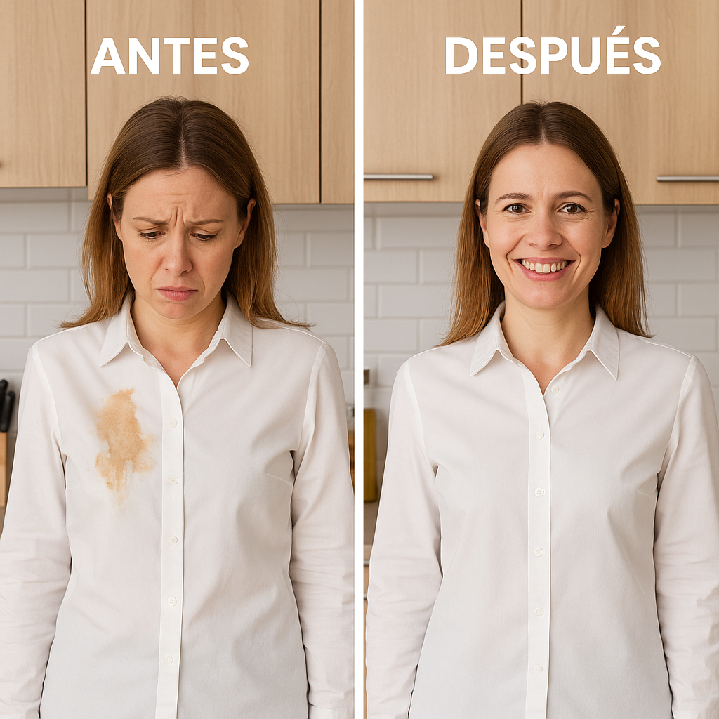 No más estrés antes de salir. Este quitamanchas actúa en cuestión de minutos, eliminando incluso las manchas más difíciles de alimentos, bebidas o suciedad sin necesidad de remojar ni repetir lavadas.